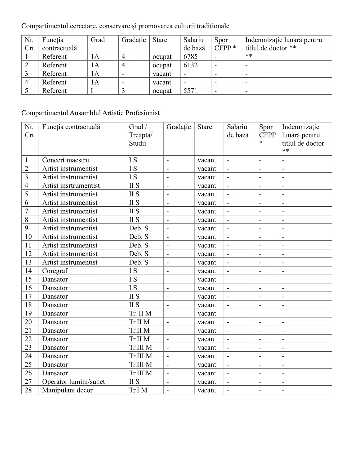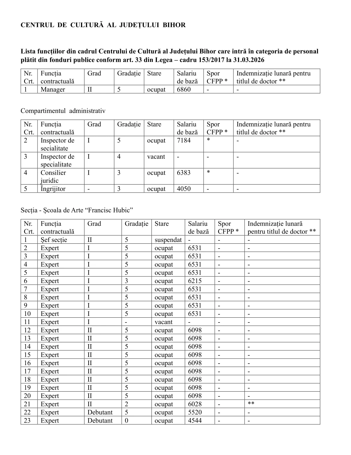 Lista funcțiilor din cadrul Centrului de Cultură al Județului Bihor care intră în categoria de personal plătit din fonduri publice conform art. 33 din Legea – cadru 153/2017 la 31.03.2026.