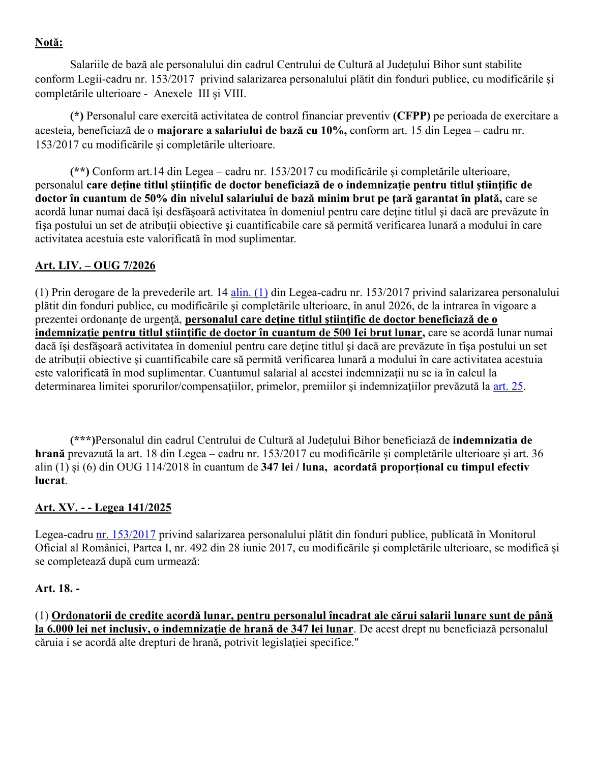 Lista funcțiilor din cadrul Centrului de Cultură al Județului Bihor care intră în categoria de personal plătit din fonduri publice conform art. 33 din Legea – cadru 153/2017 la 31.03.2026.